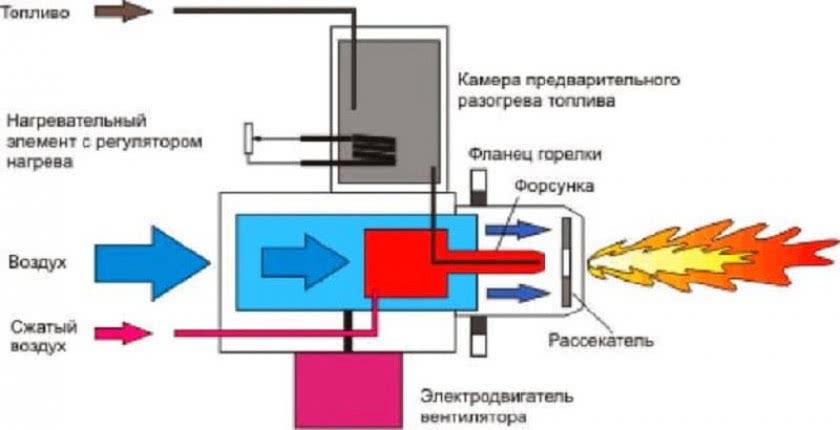 Для подачи воздуха понадобится компрессор небольшой мощности. Шланг от него устанавливается в патрубок, расположенный рядом с резервуаром с отработанным маслом. Для розжига устанавливается пьезоэлемент или аналогичное ему устройство.