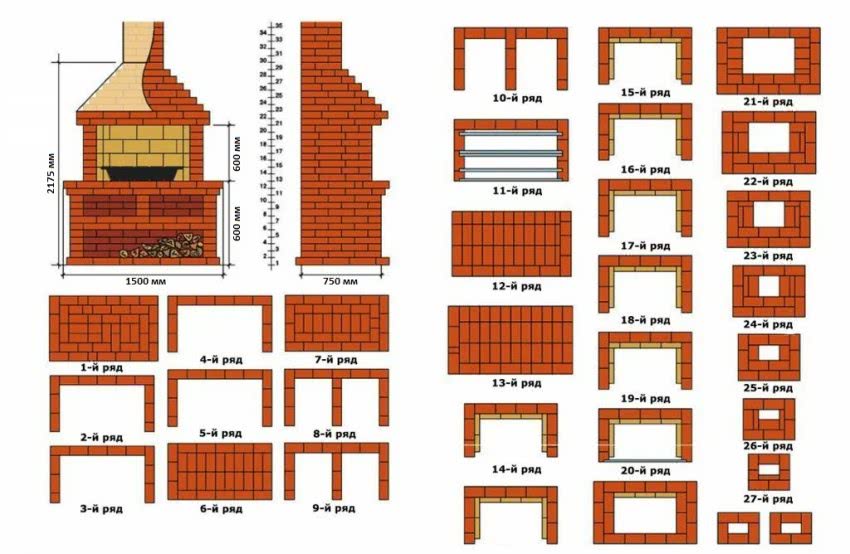 Начиная с 7-го рядка кладку ведут только на половине — правой или левой — как вам удобно, но данная раскладка дана под жарочную камеру слева — она шире, а слева находится столик. Если вам удобнее наоборот — делайте зеркальное отражение этой порядовки.