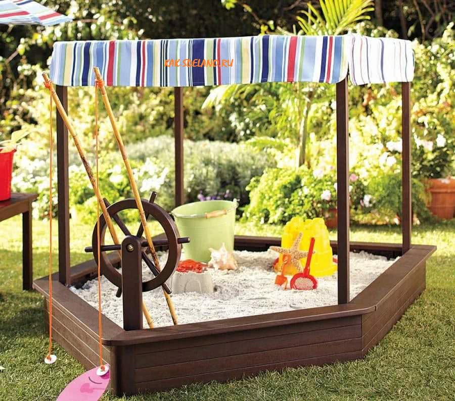 Если подойти к изготовлению творчески, то возможно соорудить целый корабль: мачту из бруска следует закрепить в центре песочницы, а парусами послужит старая простынь. Вариантов разнообразить ежедневные игры масса. Не стесняйтесь привлекать к этому делу ребёнка.