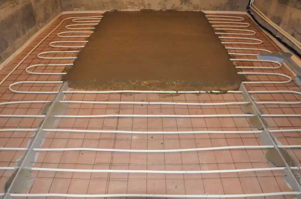 Конструкция заливается цементным раствором или самовыравнивающимся составом. Чтобы не повредить трубы контура, их обязательно закрепляют на основании, арматурной сетке или плитах теплоизоляции.