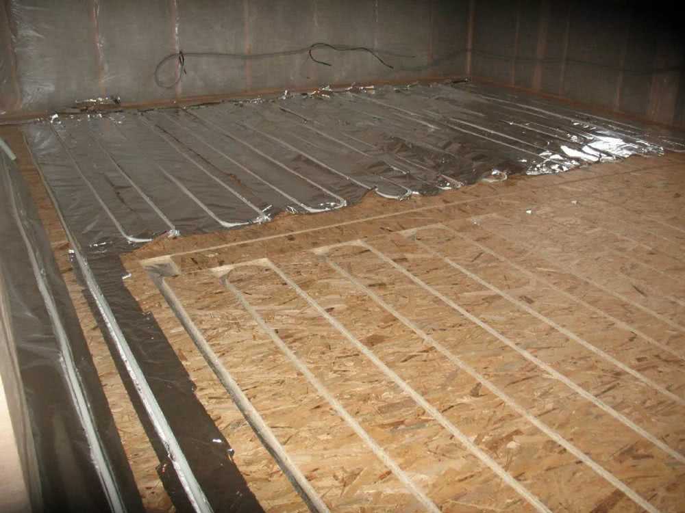 При наличии чернового пола трубы можно уложить на специальные алюминиевые пластины, которые будут не только фиксировать контур, но и выполнять роль теплоотражающего элемента.