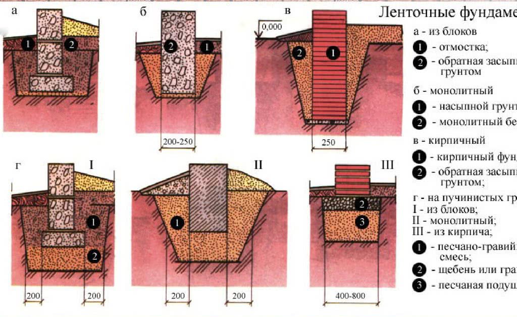 Подтипы ленточного фундамента (из блоков, монолитный, кирпичный)