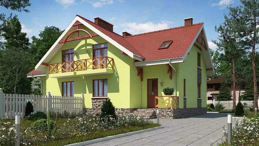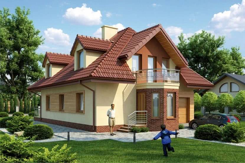 Проект №1. Проект этого дома предусматривает функциональное помещение на мансардном уровне, в котором размещена спальня, санузел и две дополнительные комнаты, которые по своему усмотрению можно обустроить под гостиные или детские. Уютный каркасный дом предполагает выполнение из кирпича и керамзитобетона. Большие окна делают внутреннее пространство дома хорошо освещенным. Здание полностью соответствует всем требованиям жилого дома.