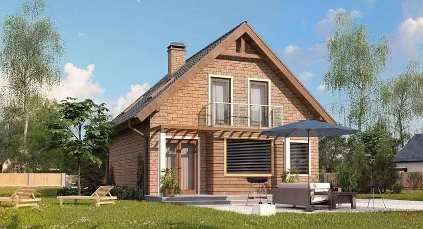 Проект №6. Бюджетный проект дома с мансардой отлично подойдет для жизни и отдыха. На первом этаже расположена большая вместительная гостиная (48,6 м2), которая может одновременно выступать и в роли столовой. На мансарде – три спальни, санузел и просторный балкон.