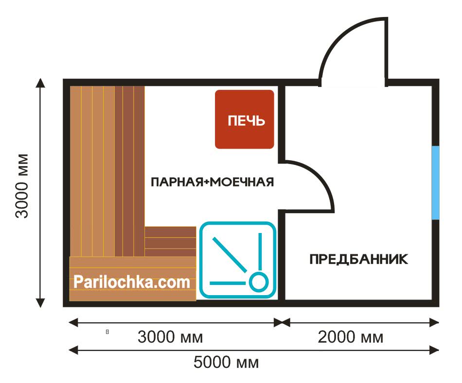 Планировка (план) бани 3х3 мойка и парилка вместе.