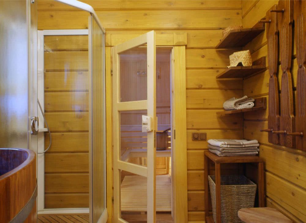 В душевой можно устанавливать как кабину, так и купель, которая является неплохой альтернативой бассейну и другим водоемам. Но в таком плане имеется один недостаток. Из-за отсутствия предбанника холод с улицы станет попадать в комнату, где люди отдыхают, поэтому подобная планировка является хорошим вариантом для тех, кто хочет посещать баню лишь летом или весной.