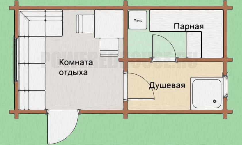 В таких банях также лишь 3 помещения, но парная, в отличие от предыдущего варианта, является более просторной. Душ же не слишком большой. Вместимость подобных строений высокая, поэтому они являются лучшим выбором для тех, кто хочет париться в большом кругу друзей. Недостаток построек — отсутствие изолированного тамбура, так как он объединяется с комнатой для отдыха.