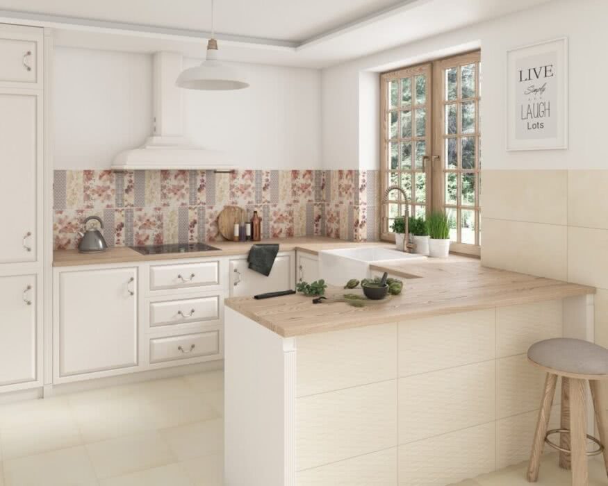 А пол кухни в стиле кантри можно декорировать вставками из плитки с рисунком или узором.