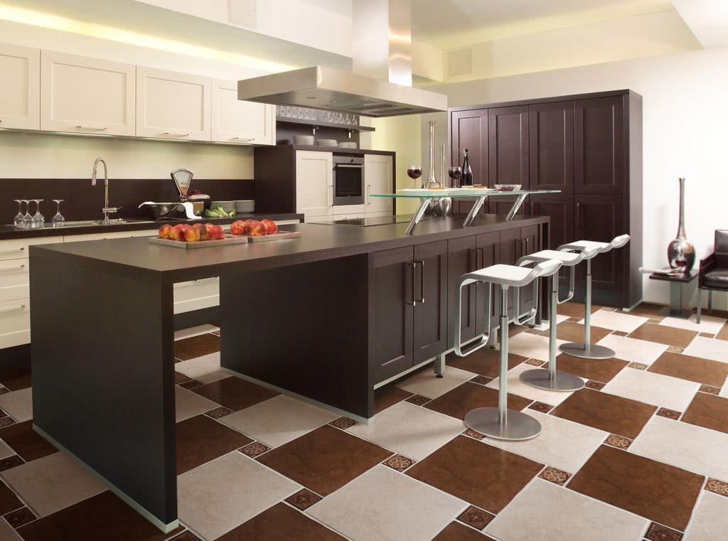 Один из самых сбалансированных вариантов, при котором светлая плитка на кухню на пол сочетается с темной и выкладывается в шахматном порядке. На фото как раз такие варианты.