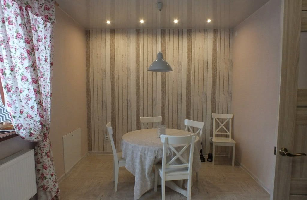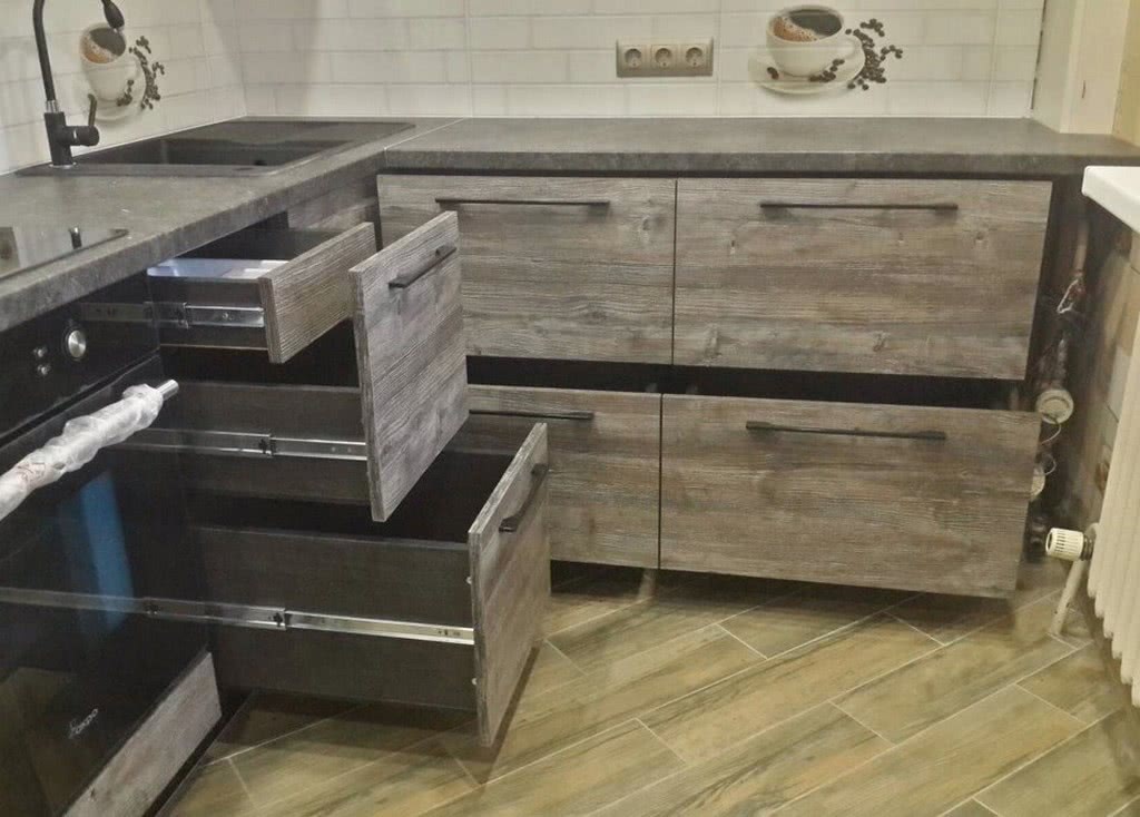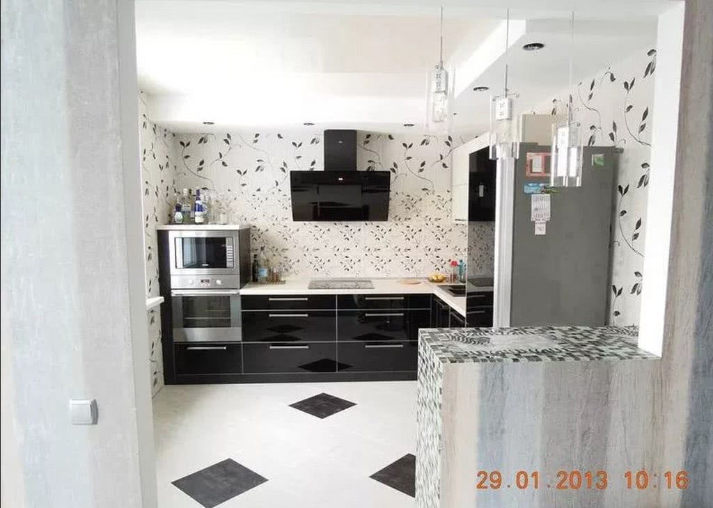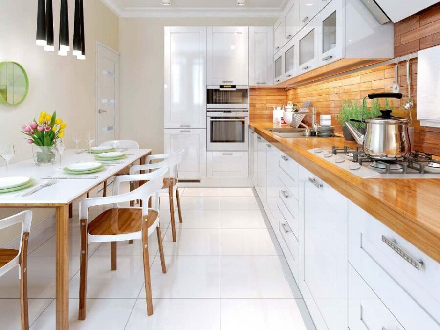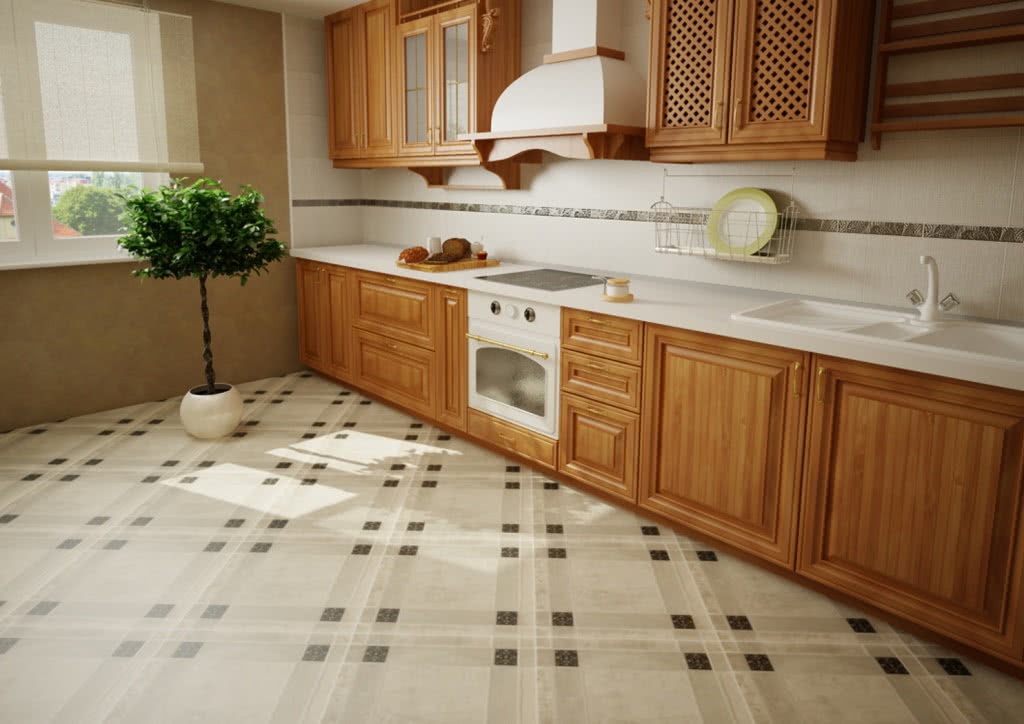 Плитка прекрасно будет смотреться с ламинатом, линолеумом, деревом. При этом плитку укладывают в рабочей зоне, а все остальные материалы станут покрытием для оставшейся территории.