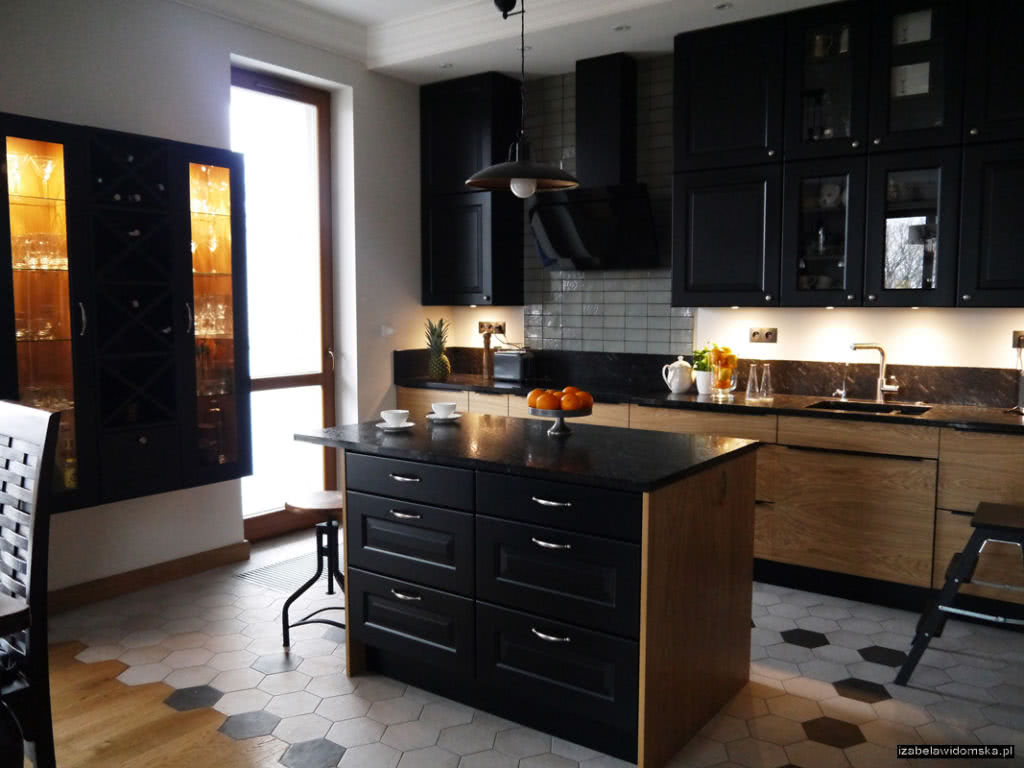 Темный кухонный пол – этот интересный оттенок, встроенный в большую поверхность, выглядит благородно и интересно. Однако не секрет, что темный пол требователен. Минималистская мебель с прямыми фасадами – лучшая компания для нее. Они могут быть противовесом по цвету.