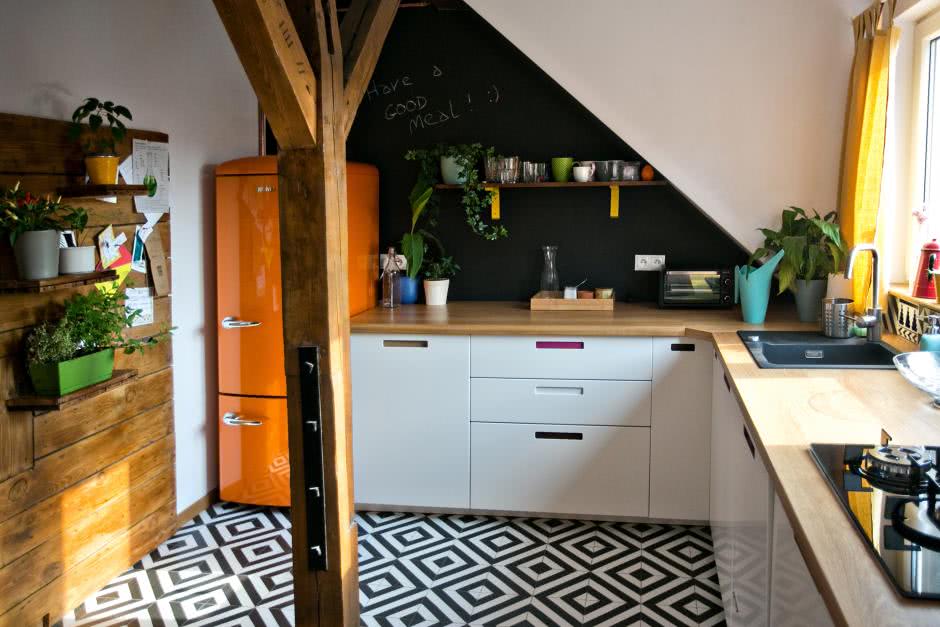 Такой пол идеально подойдет для классических интерьеров, но его все чаще выбирают для современных кухонь, в которых царит эклектика.