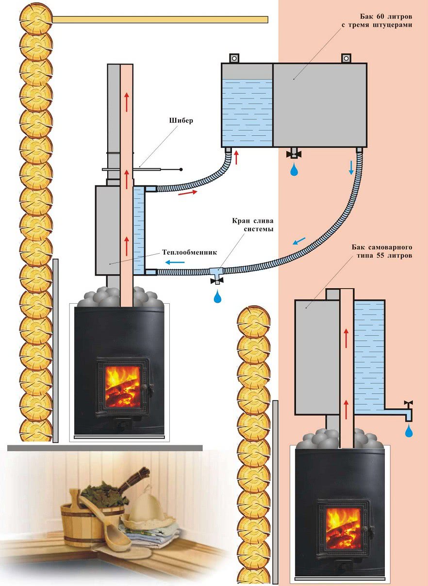 В различных конструкциях печек с теплообменником существуют варианты подключения водяной системы, чтобы обеспечить горячей водой душевую, или системы отопления, чтобы она постоянно работала в бане.
