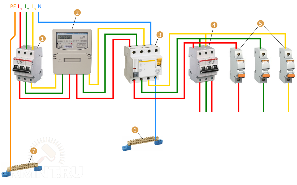 В данной схеме перед счетчиком электроэнергии установлен вводной четырехполюсный автоматический выключатель. После счетчика питание электроприемников производится через групповые однополюсные автоматические выключатели с равномерным распределением нагрузки по фазам. Эту схему можно использовать для электроснабжения своей дачи или коттеджа.