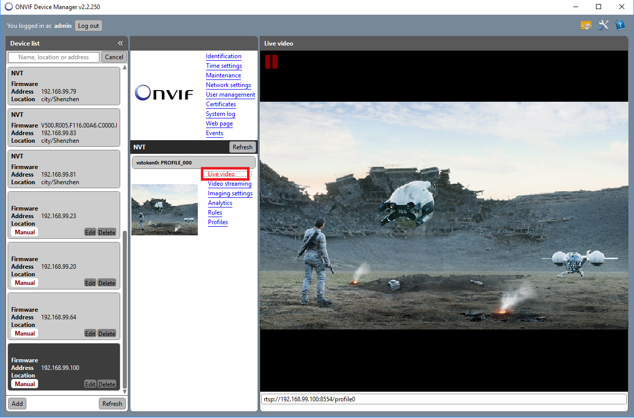 rtsp://192.168.99.100:8554/profile0 для основного видеопотока