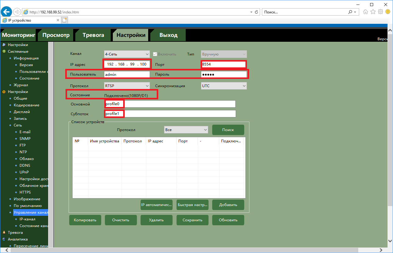 Отдельно вводится IP адрес, порт RTSP (обычно – 554, в нашем примере – 8554), логин, пароль.