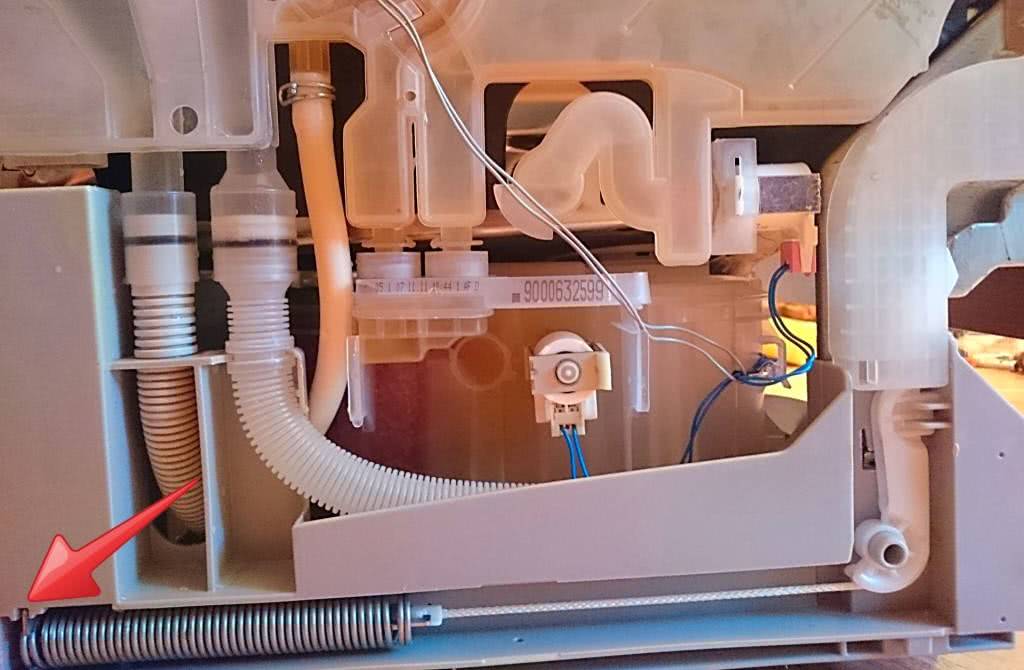 Жидкость отводится под давлением, что важно при перепаде высоты отверстия в посудомоечной машине и в канализации. Делается это насосом (8)