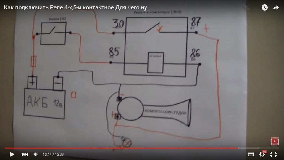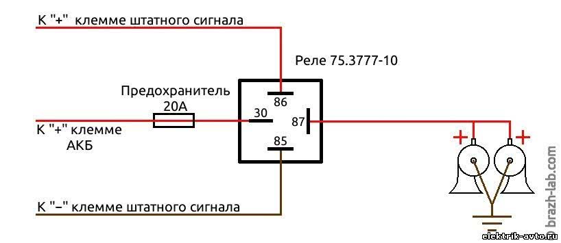 . Теперь (+) постоянно подается на контакты86 и30 . Берем 2 длинных провода. Один подключаем к контакту87 , второй – к ближайшему (-). Я в данном случае просто зачистил розовый провод и подключил второй провод к нему. Накидываем этм провода на контакты гудка. Все готово, можно пугать соседей /images/smilies/wink.gif