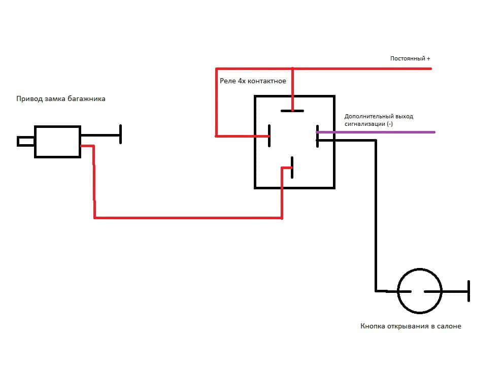 Если в автомобиле стоит электрический привод багажника, то можно подключиться к нему автосигнализацией для открытия его с брелока сигнализации. Если с сигнализации выходит слаботочный сигнал на открытие багажника (а чаще всего так и есть), то используем эту схему. Прежде всего, находим провод на привод багажник, где появляется +12 Вольт при открытии багажника. Разрезаем этот провод. Тот конец разрезанного провода, который идёт к приводу, подцепляем к контакту 30. Другой конец провода подцепляем к контакту 87А. Выход с сигнализации подцепляем к контакту 86. Контакты 87 и 85 подцепляем на +12 Вольт. Теперь, при подаче сигнала с сигнализации на открытие багажника, реле сработает и на провод электропривода багажника пойдёт «плюс». Привод сработает, и багажник откроется. Это лишь немногие схемы подключения с использованием реле.