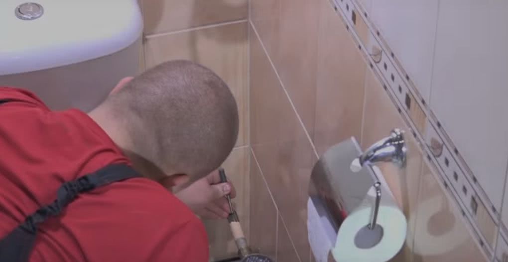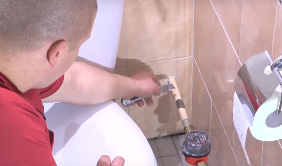 1. Вырезаем сквозное отверстие в стене для вставки крана. Для этого лучше всего использовать электродрель. После закрываем неровности плиткой. С другой стороны вырезаем отверстие в трубе (как в случае с установкой муфты) и прикручиваем переходник.