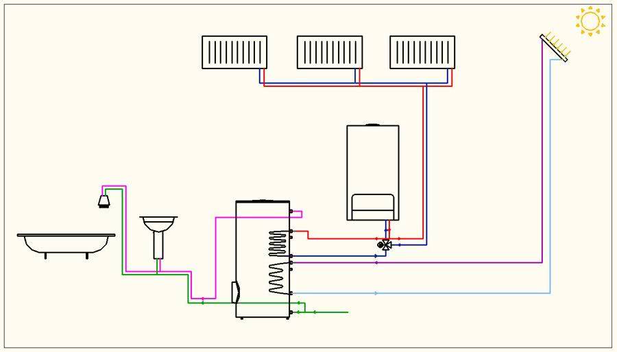 - Врезать в отдельный контур, независимый от системы отопления, что очень удобно, поскольку систему отопления можно отключить и направить энергию теплоносителя на бойлер.