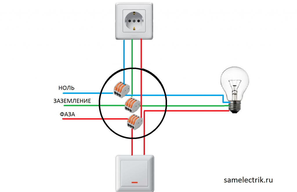 Коммутирование розетки и выключателя в электрораспределительной коробке