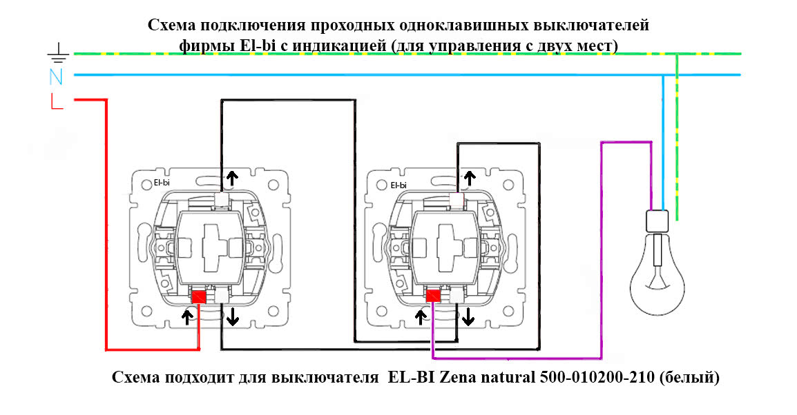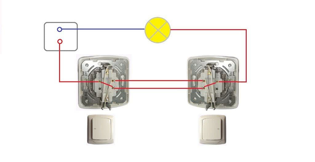 В примере с фото приборов сзади цепь разомкнута, и лампа не горит. На нижней части иллюстрации цепь замкнута, и свет включен. Можно сказать, что в данной схеме подключения один обычный выключатель заменен двумя одноклавишными проходными, соединенными между собой двухжильным кабелем.