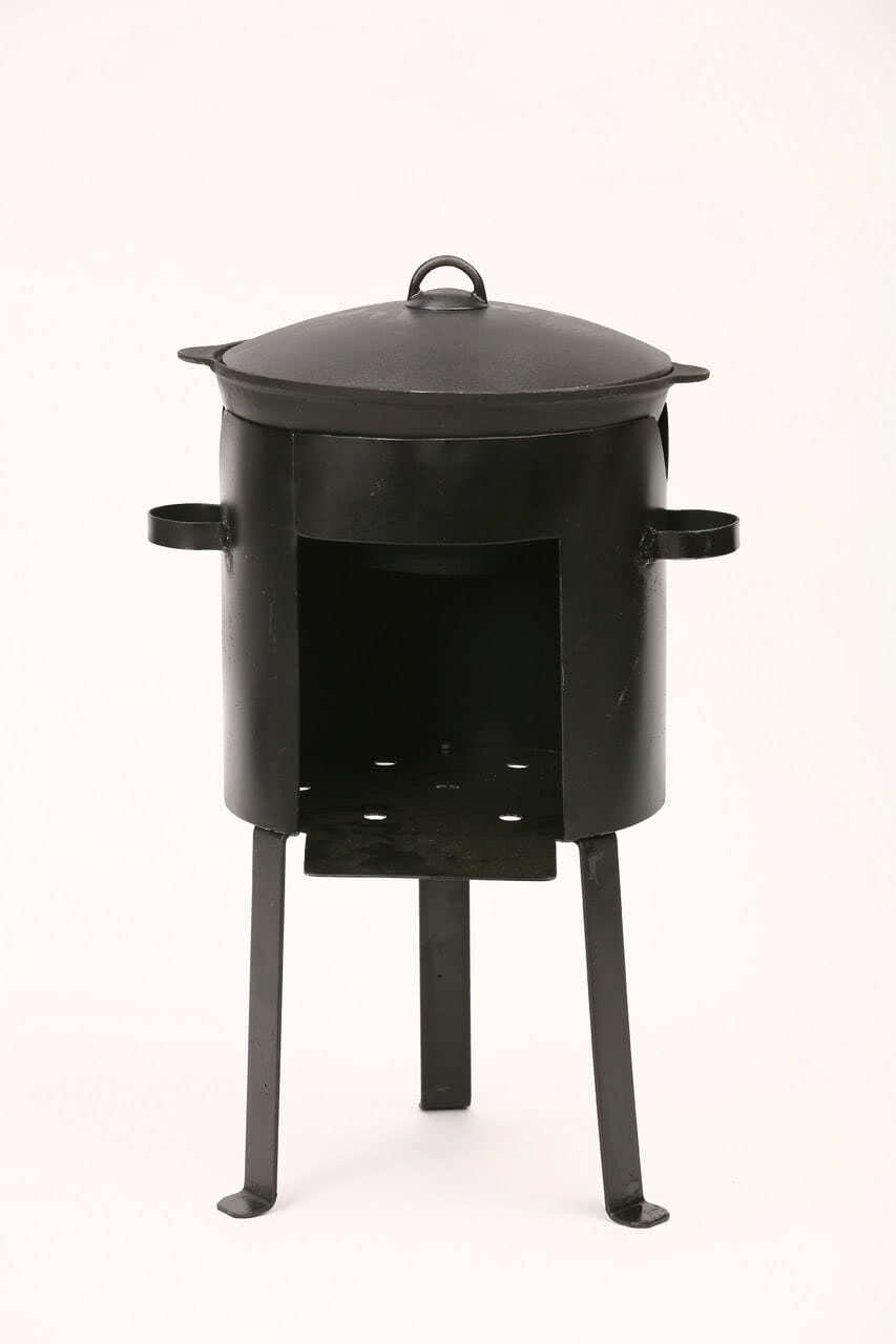 - Круглая – удобный вариант для приготовления сложных блюд. Такая подставка выглядит как короткий цилиндр на трех ножках, сверху в него ставится казан. В стенке предусмотрено отверстие для разведения огня под емкостью. Это удобный вариант, который быстро нагревает и готовит еду, обходясь небольшим количеством дров или угля. При всем удобстве это объемная конструкция: диаметр трубы для казана объемом 10–12 литров будет не меньше 40 см.