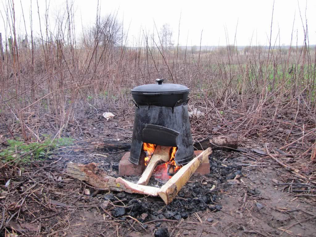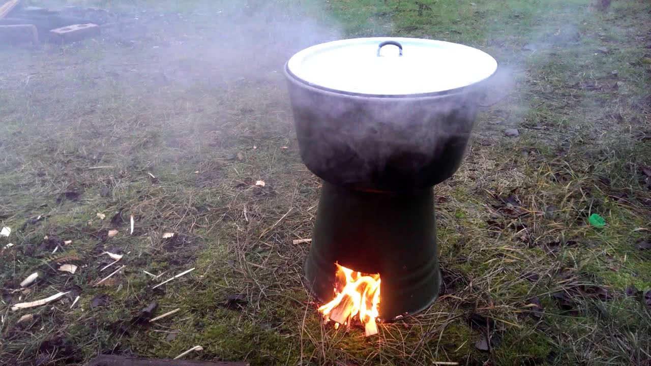 При приготовлении еды на такой печи происходит экономное расходование тепловой энергии, ведь пламя надежно защищено от ветра. В такой печи прогрев котла происходит в разы скорее, нежели на открытом костре.