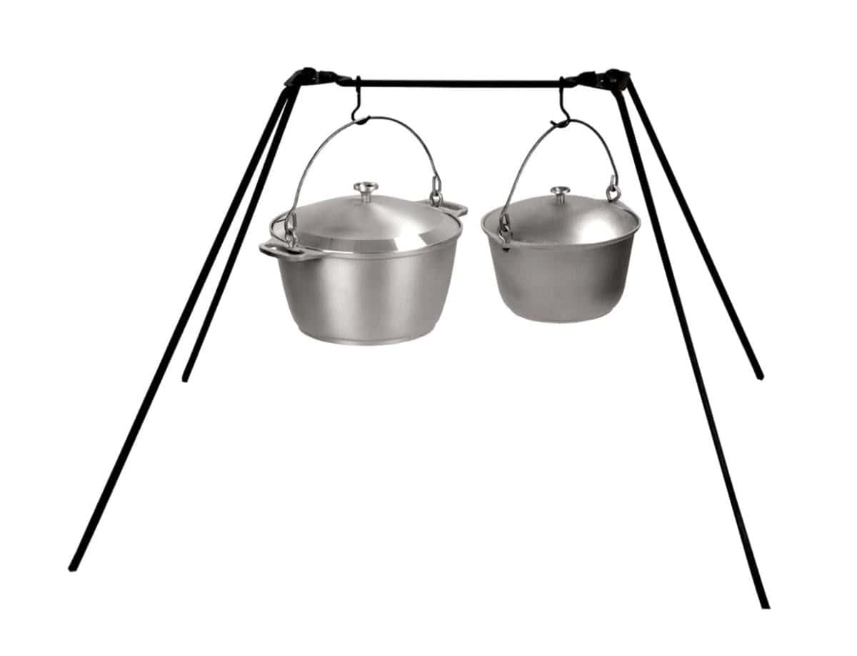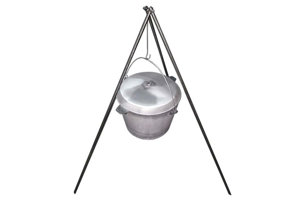- Малая – тренога для казана высотой около 70 см легко и быстро устанавливается над огнем. Крючок цепляется на цепочку, благодаря такой конструкции легко регулировать высоту для разных видов посуды, а также управлять температурой приготовления пищи. Малая подставка пользуется особым спросом у туристов, поскольку ее легко переносить.