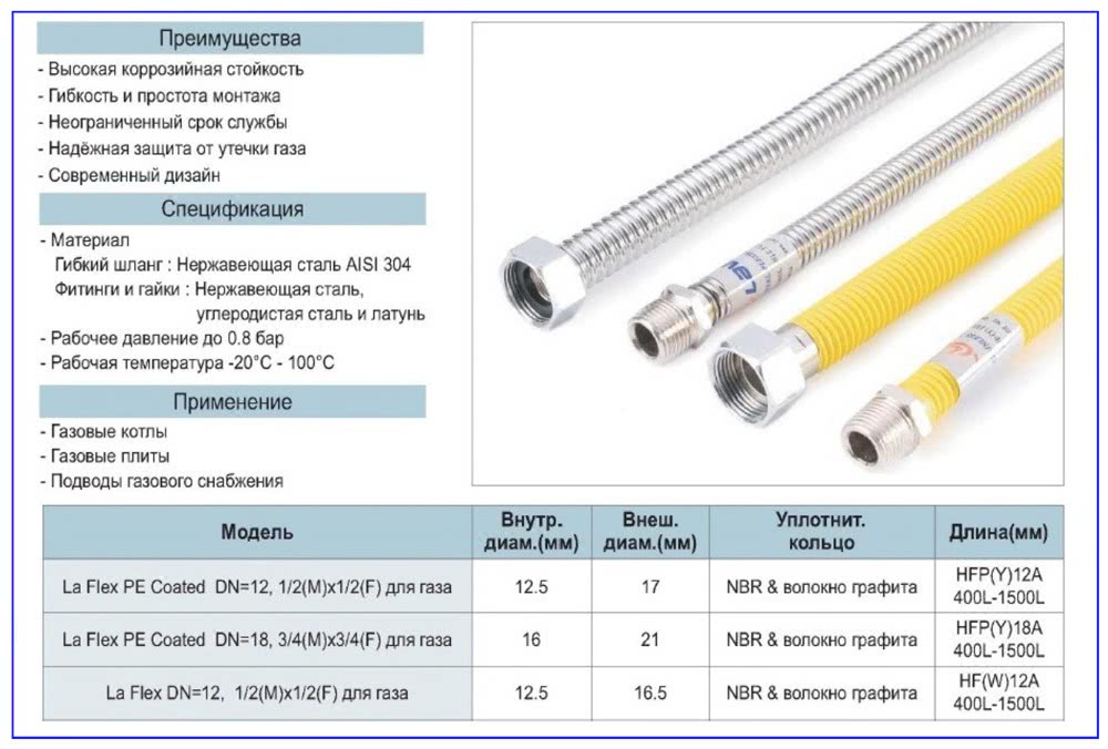 Современные производители предлагают большой выбор гибких шлангов для газа, которые отличаются материалом и качеством изготовления, что и влияет на окончательную стоимость готового изделия. Экономить на покупке не следует, поскольку только правильно выбранный шланг позволит избежать такой проблемы, как утечка газа, которая может привести к серьезным последствиям. В настоящее время, помимо сильфонных шлангов, производители предлагают и другие виды изделий: