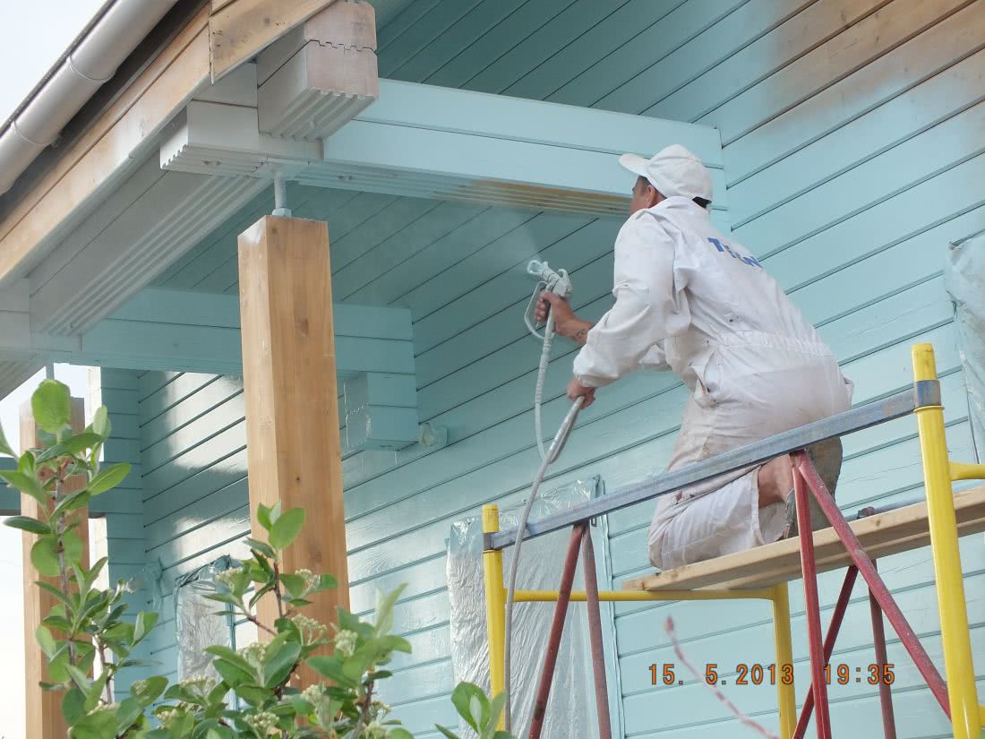 Цена покраски имитации бруса для монтажа снаружи дома будет дороже, чем для работ, производимых внутри помещения. Стоимость варьируется от того, что для защиты от агрессивной среды на фасаде необходимо использовать более дорогостоящие и с большим сухим остатком ЛКМ.