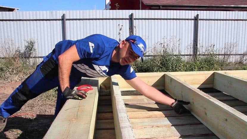 1. Монтаж опорного бруска по нижнему контуру лаг и несущего настила из досок 25 мм водостойкого ДСП или ОСП.