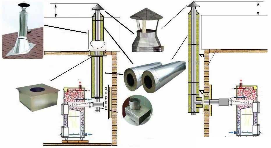 Стоит отметить, что использование сэндвич-трубы с собственной термозащитой и вторым металлическим кожухом не меняет ситуацию. Такие каналы снаружи нагреваются также до опасных температур, как изнутри. Такое решение было разработано только с целью положительного влияния на устойчивость тяги. Поэтому отступы соблюдаются по аналогии с одностенными дымоходами.