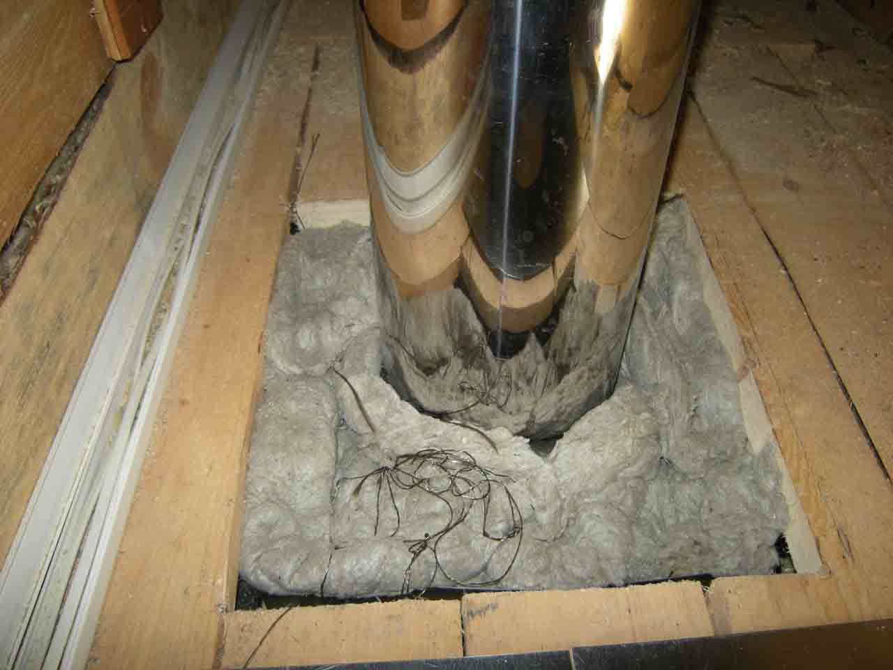Проход круглой трубы дымохода через деревянный потолок при помощи ППУ разной конструкции