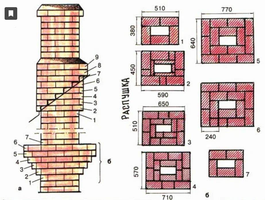 Кирпичную трубу изолируют либо с помощью кирпича, либо бетона. Для того, чтобы кирпичный ППУ надежно соединялся с трубой, делается «распушка» — это постепенное увеличение сечения трубы за счет дополнительных кирпичей.