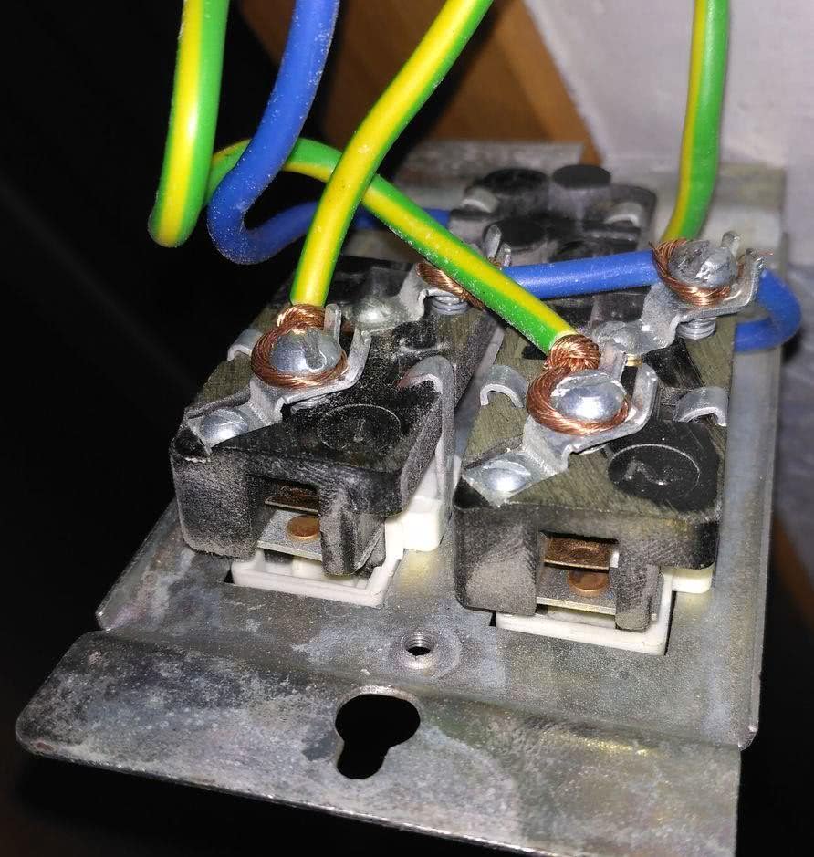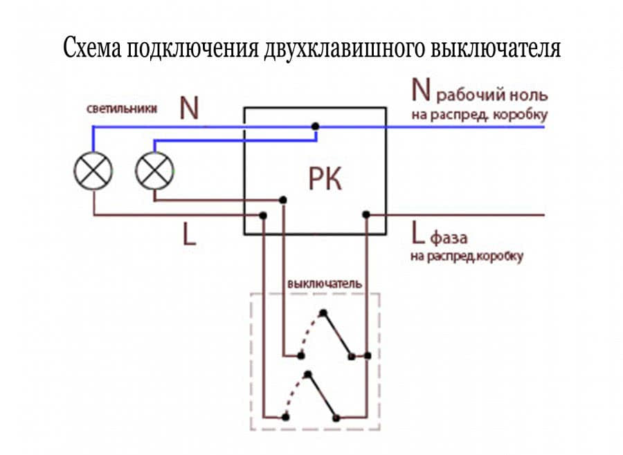 Подключение двухклавишного выключателя потребует больших знаний электрики, это обосновывается тем, что все группы светильников имеют отдельный разрыв цепи. Как и с одноклавишным агрегатом, в коробке распределения присутствует две жилы. Провод синего цвета ещё на входе соединяется с другими проводами аналогичного цвета.