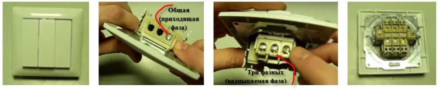 Обязательно нужно учитывать тот факт, что задняя часть корпуса содержит три отверстия: два размещены по левую сторону, и ещё один по правую. Туда где только одно отверстие подсоединяется фаза входа, а туда, где два отверстия – фаза выхода, направляющаяся к светильнику.