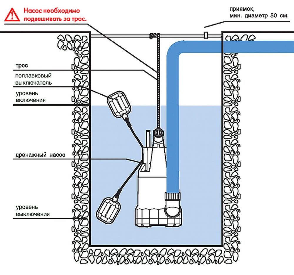 Такие насосы работают автоматически, используя поплавковую систему или пластиковый пузырь, которые сигнализируют о повышении уровня воды и включают насос.