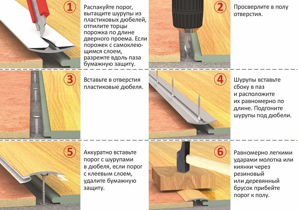 Установка порожков зависит от типа и материала, из которого они изготовлены.