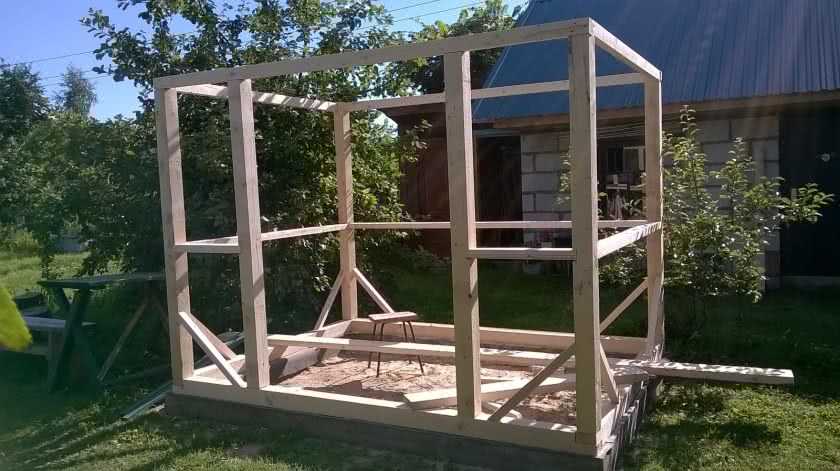 Вариантов конструкций много. Чаще всего ставят каркасное сооружение. Основу делают из деревянного бруса или металлических элементов. Во втором случае постройка прочнее, ее можно перевозить на другое место. Обшивают вагонкой, досками, плитами ОСБ, сайдингом.