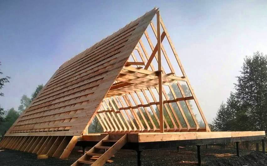 Идея А-образной постройки проста и оригинальна. Заключается она в отказе от стен и замене их крутой двускатной крышей, которая опускается от конька до фундамента. Также возможен комбинированный вариант с невысокой коробкой. Используется ленточный или свайный фундамент на песчаной подушке. Общая конструкция постройки — каркасная основа из нескольких треугольных рам.
