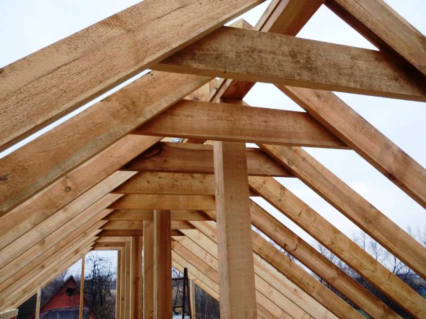 - использование срощенных балок: из-за большой длины стропил невозможно использовать цельные балки.
