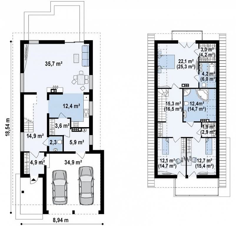 Планировка узкого дома, первый этаж и мансардаИсточник rekoweb.ru