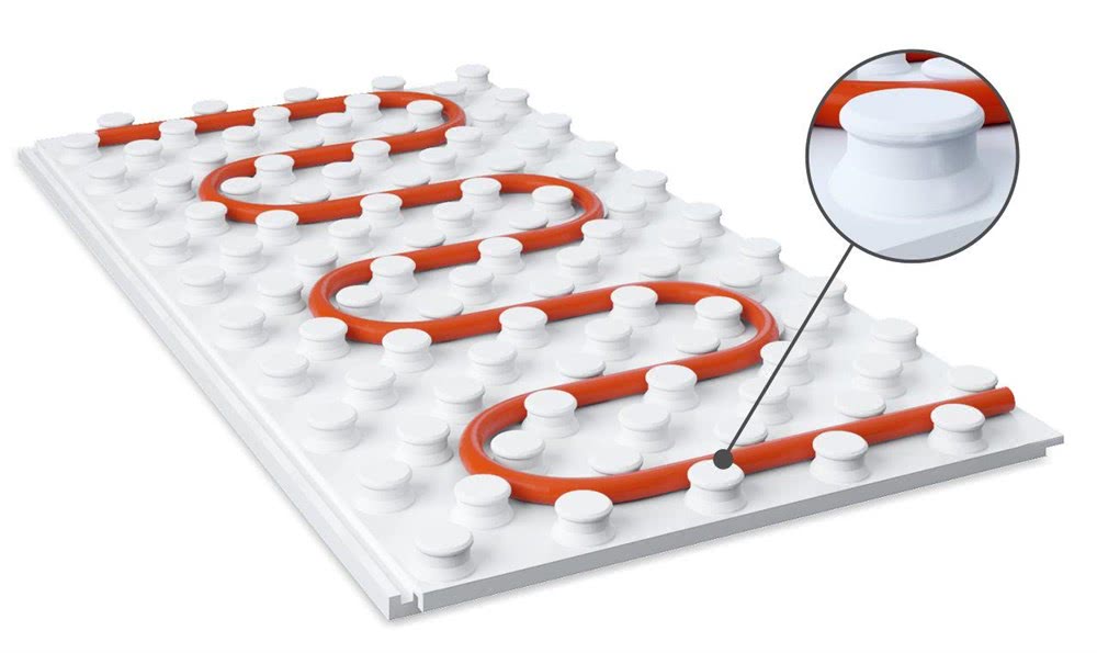 - В специальные полистирольные плиты с пазами укладываются пластины, которые распределяют тепловую энергию. Монтаж начинается также с утепления поверхности пола, затем укладываются плиты из полистирола.