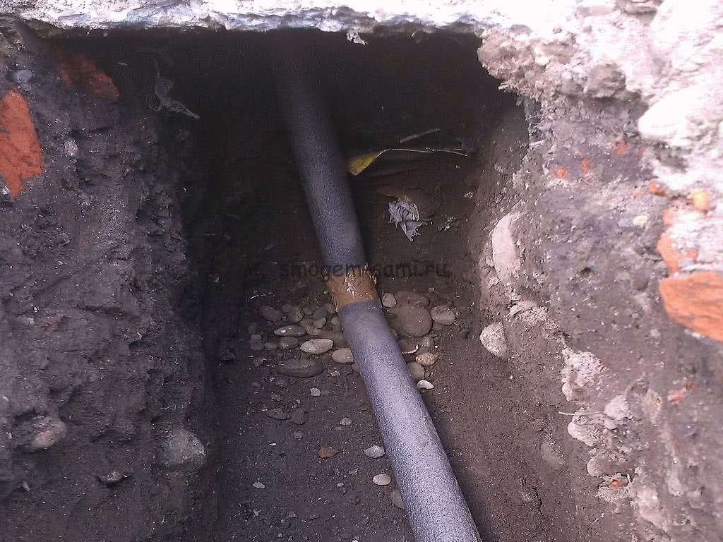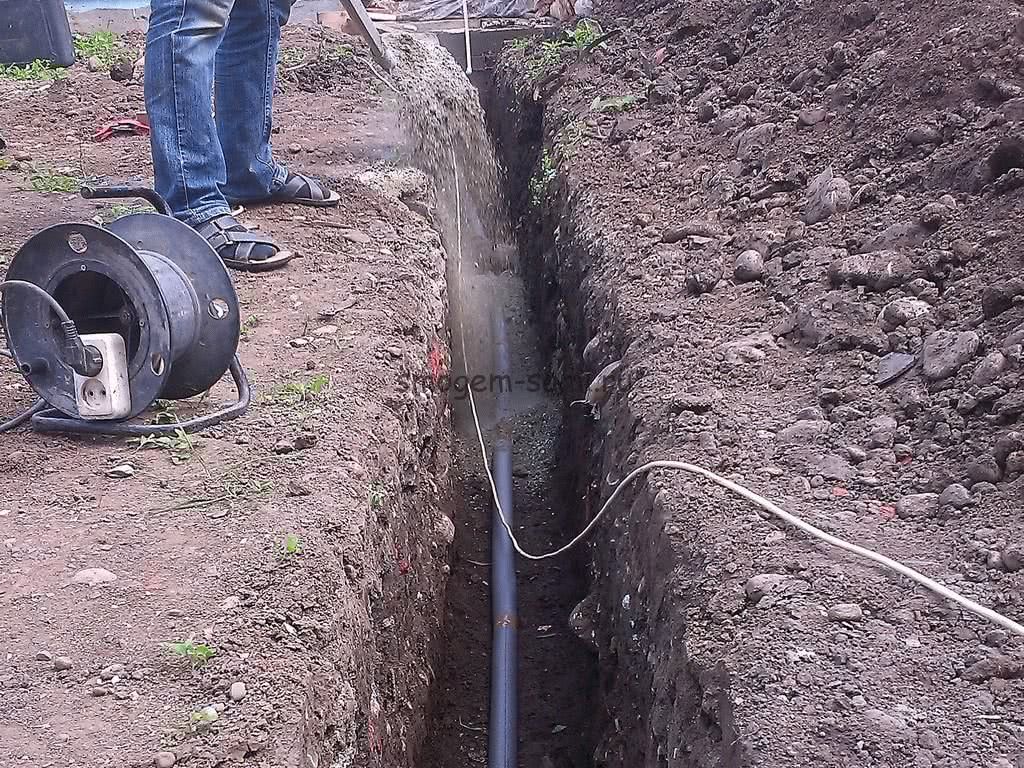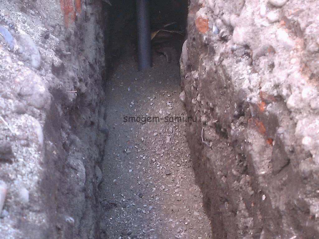 - После прокапывания канала на его дно засыпают слой песка толщиной 5 — 10 см. и затем укладывают трубопровод на песчаную подушку, засыпая обратно извлеченный грунт.