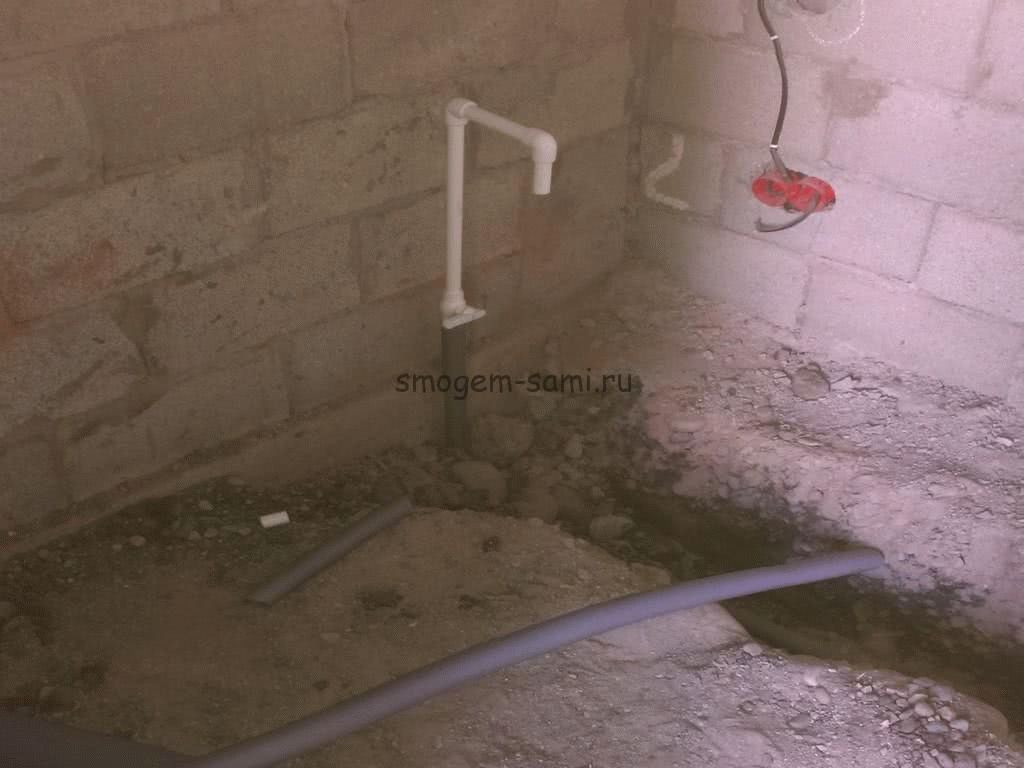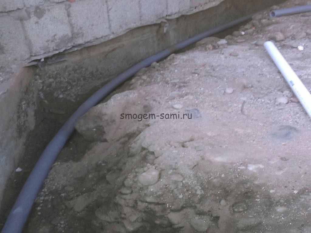 Внутри дома труба должна лежать так, чтобы в процессе строительных работ ее не повредили. Если для этого необходимо прокопать небольшое углубление, лучше это сделать. Зайдя в здание в траншее линия продолжает свой путь к месту, откуда начнется вся разводка.
