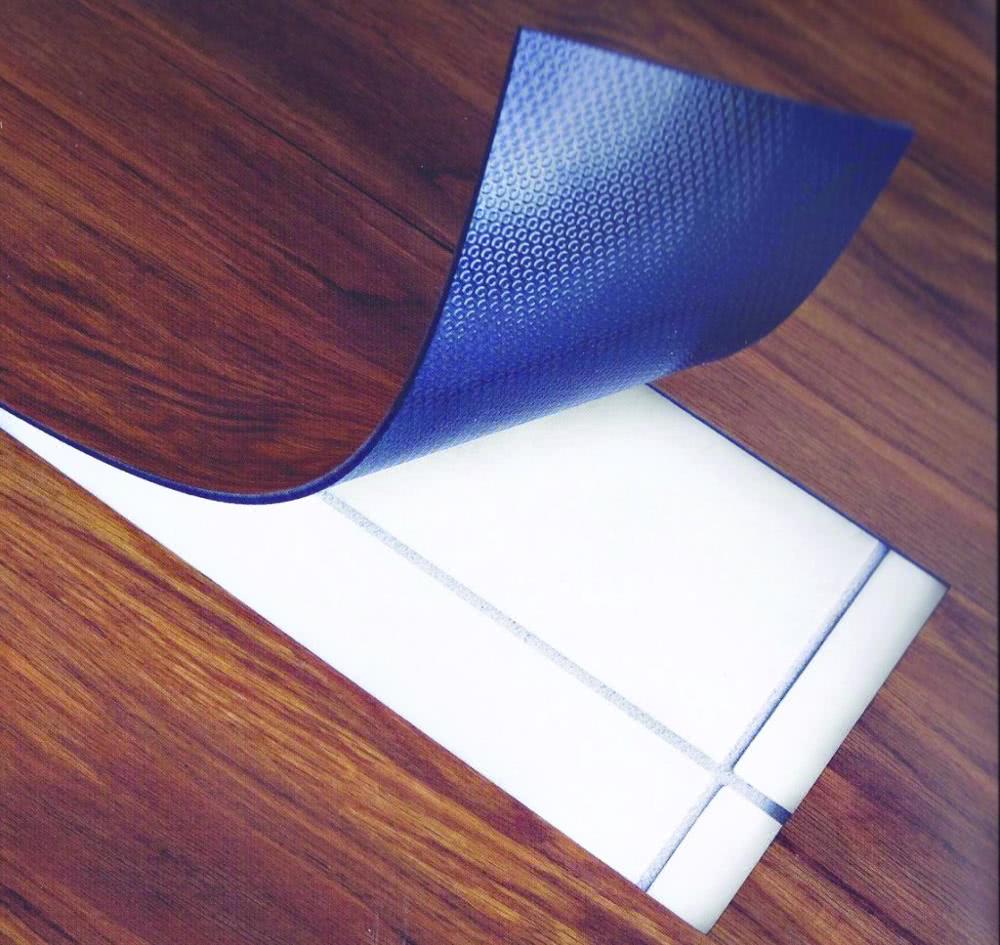 - Самоклеющийся ПВХ кафель уже имеет клеящую сторону, поэтому ее наносят сразу на предварительно подготовленную поверхность.