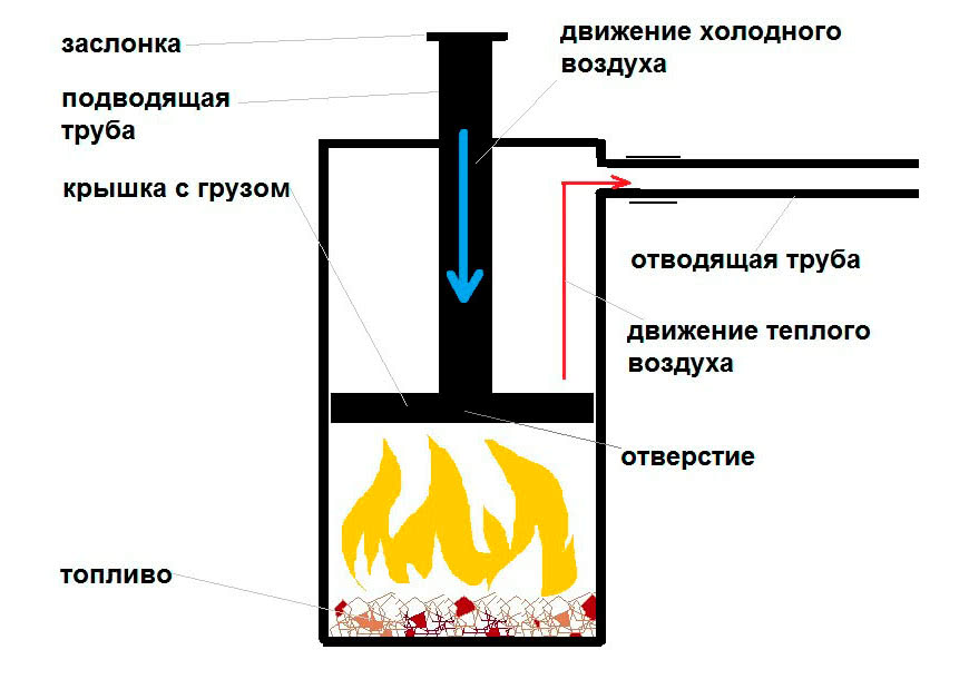 Для того чтобы понять суть этой необычной печи длительного горения, необходимо просто взглянуть на ее схему. Агрегат состоит из трех основных частей – это корпус, дымоход, тяжелый поршень и крышка.