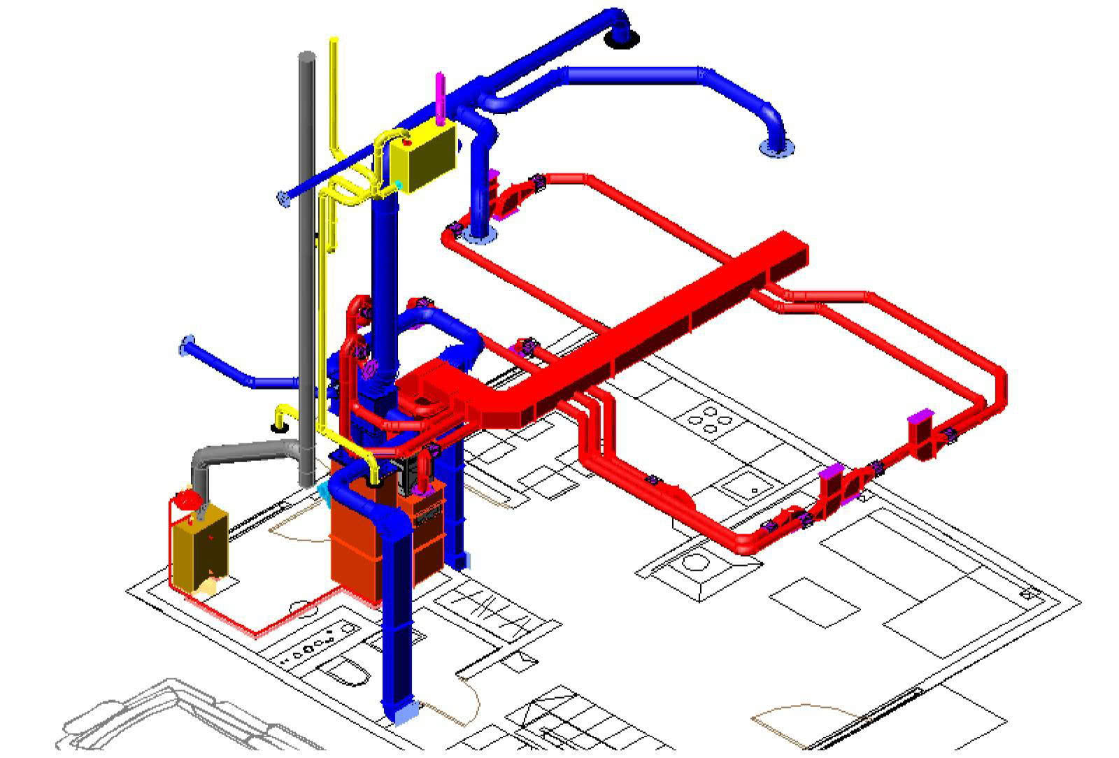 - С помощью поэтажных планировок можно определить длины горизонтальных участков воздухопроводов. Если же на аксонометрической схеме проставлены отметки высот, на которых проходят каналы, то протяженность горизонтальных участков тоже станет известна. В противном случае потребуются разрезы здания с проложенными трассами воздухопроводов. И в крайнем случае, когда информации недостаточно, эти длины придется определять с помощью замеров по месту прокладки.